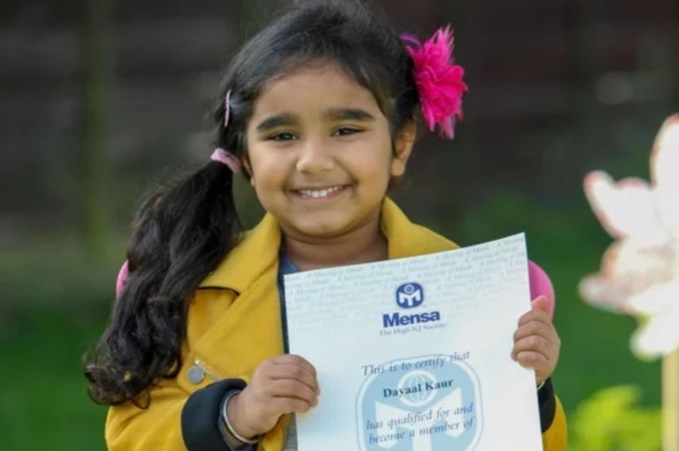 El club de membresía Mensa para niños con Excelente Inteligencia, que agrupa a diversas asociaciones de superdotados, admitió a la niña de 4 años Dayaal Kaur, nacida en Birmingham, Reino Unido, luego de que rindiera una prueba online para el ingreso en la que obtuvo un coeficiente cercano al de Albert Einstein.