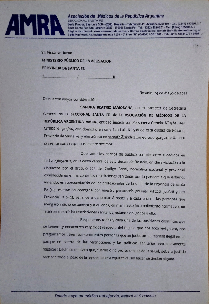 En la mañana de este martes el Sindicato de Médicos de la República Argentina (AMRA) Seccional Santa Fe presentó una denuncia ante el Ministerio Público de la Acusación debido al accionar de los mal denominados "Médicos por la verdad" quienes el domingo, violando el artículo 205 del Código Penal en el marco de las restricciones sanitarias dispuestas por el DNU del Poder Ejecutivo, se juntaron en la costa central de la ciudad de Rosario sin respetar la distancia ni utilizar ningún tipo de barbijo o tapaboca.