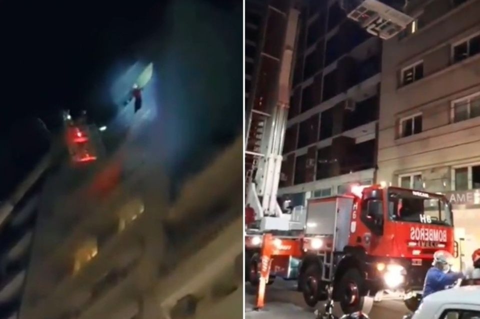 Según el video publicado por la cuenta Oficial de la Subsecretaría de Emergencias de la Ciudad de Buenos Aires, el futbolista de Rentistas estaba colgado de la ventana acorralado por las llamas del incendio que se había originado en el piso de su habitación.