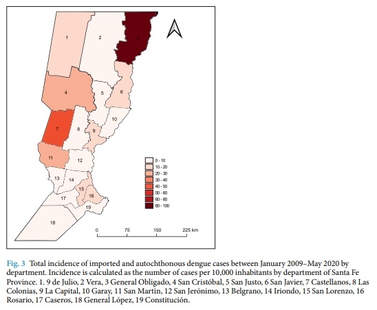 En el estudio publicado se realiza un análisis espacial y temporal de los casos de dengue, a partir de datos provistos por el Ministerio de Salud de la Nación, concluyendo que en la provincia de Santa Fe se produjeron cuatro brotes en los años 2009, 2016, 2019 y 2020, siendo el de mayor importancia el de 2020, con una incidencia cuatro veces mayor que el último más importante del año 2016. Por consiguiente, la incidencia de la enfermedad va aumentando en la provincia a medida que pasa el tiempo y los brotes son cada vez más frecuentes.