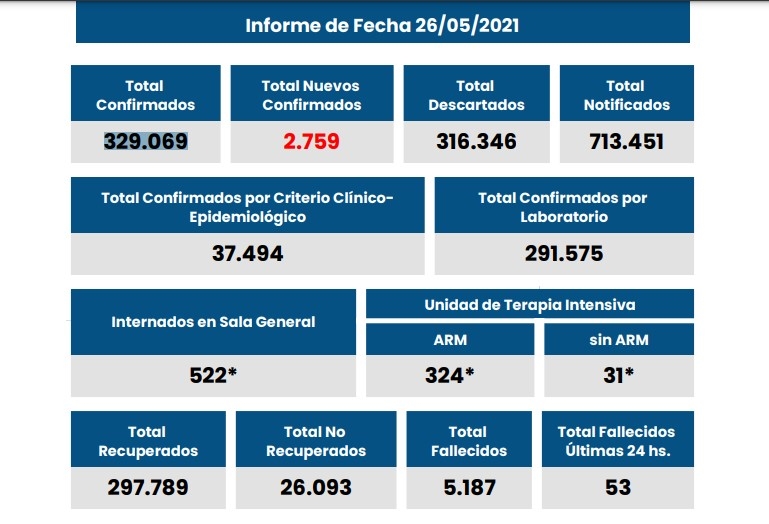 Además, se reportaron 53 fallecidos a causa del covid. Once pacientes son de la capital provincial.