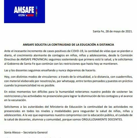 "Ante el incesante incremento de casos positivos de COVD-19, la cantidad de vidas que se pierden a diario, el crecimiento alarmante de contagios en niños, niñas y adolescentes, desde la Comisión Directiva de Amsafe provincial seguimos sosteniendo que primero está la salud, y le solicitamos al Gobierno de Santa Fe que continúe con las restricciones que hasta hoy se mantienen", expresa el comunicado.