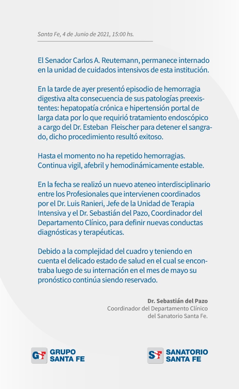 Según el último parte de Salud del Sanatorio Santa Fe sobre el estado del senador nacional Carlos Reutemann indica que sigue internado en cuidados intensivos.