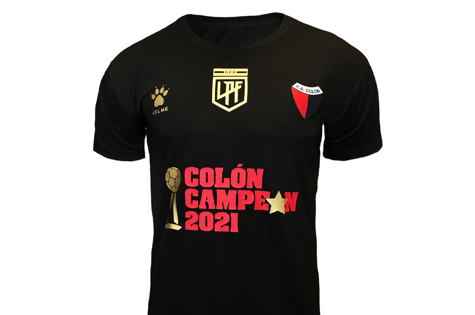 La camiseta confeccionado por la marca Kelme es negra, con la leyenda con letras rojas en el frente de Colón Campeón 2021 y una estrella dorada, más el dibujo del trofeo.