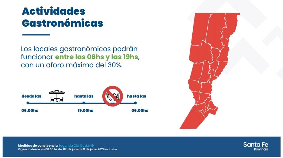 -Actividades Gastronómicas: los locales gastronómicos podrán funcionar entre las 06hs y las 19hs, con un aforo máximo del 30%.