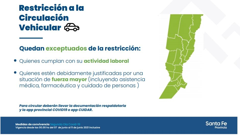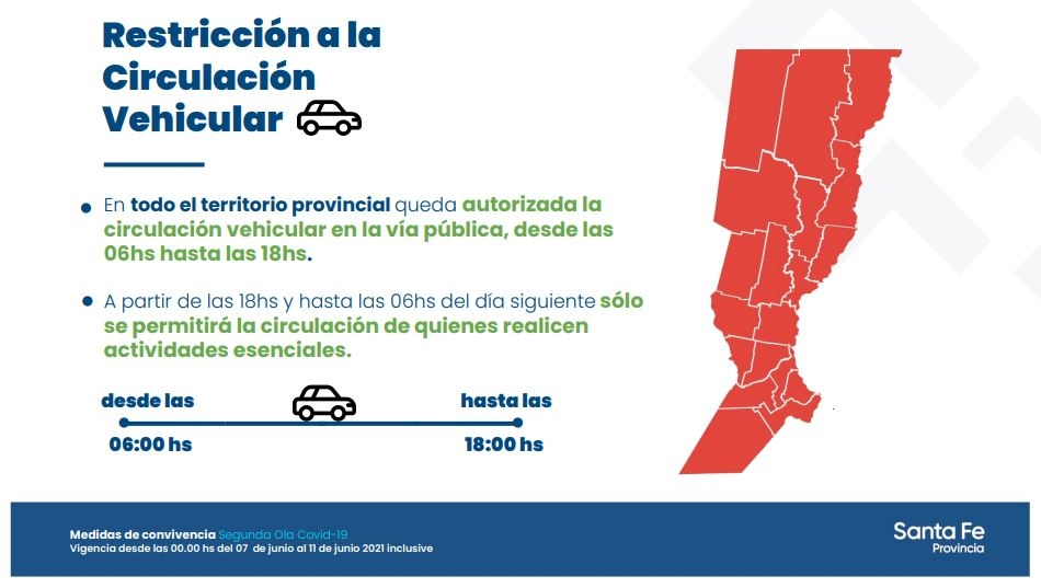 -Restricción a la Circulación Vehicular: en todo el territorio provincial queda autorizada la circulación vehicular en la vía pública, desde las 06hs hasta las 18hs. A partir de las 18hs y hasta las 06hs del día siguiente sólo se permitirá la circulación de quienes realicen actividades esenciales.