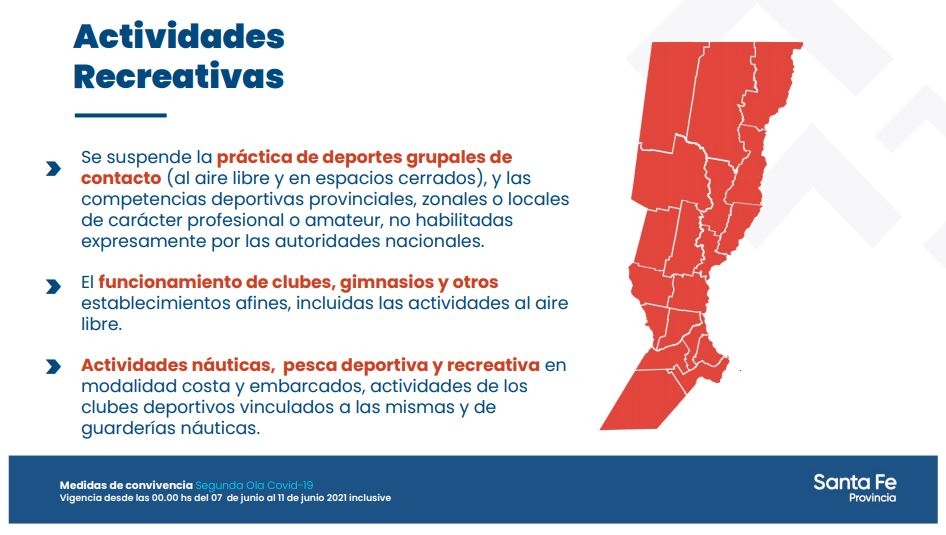 El funcionamiento de clubes, gimnasios y otros establecimientos afines, incluidas las actividades al aire libre. Actividades náuticas, pesca deportiva y recreativa en modalidad costa y embarcados, actividades de los clubes deportivos vinculados a las mismas y de guarderías náuticas.
