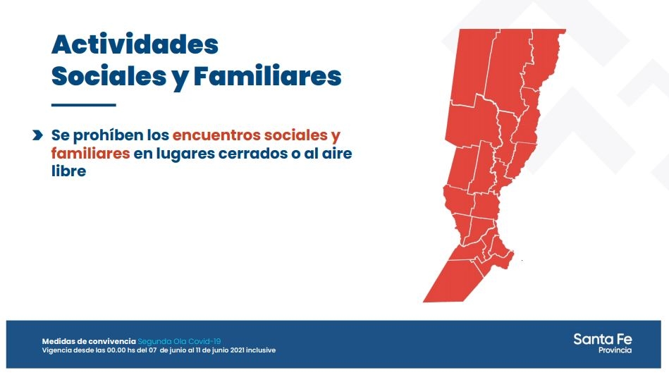 -Actividades Sociales y Familiares: se prohíben los encuentros sociales y familiares en lugares cerrados o al aire libre.