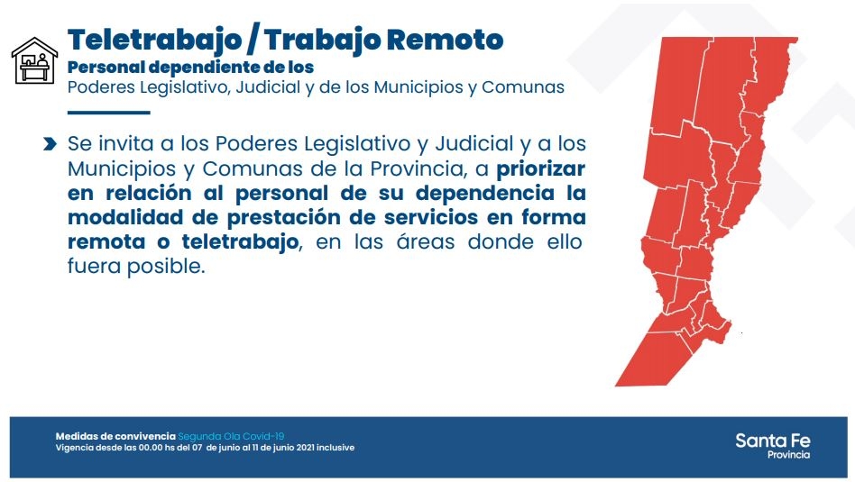 -Teletrabajo / Trabajo Remoto Personal dependiente de los Poderes Legislativo, Judicial y de los Municipios y Comunas: Se invita a los Poderes Legislativo y Judicial y a los Municipios y Comunas de la Provincia, a priorizar en relación al personal de su dependencia la modalidad de prestación de servicios en forma remota o teletrabajo, en las áreas donde ello fuera posible.