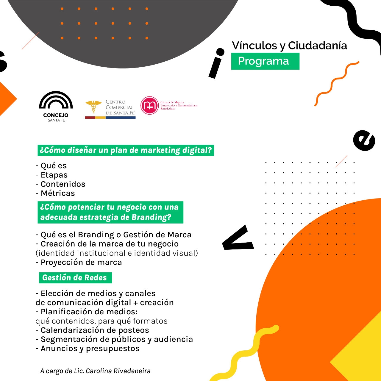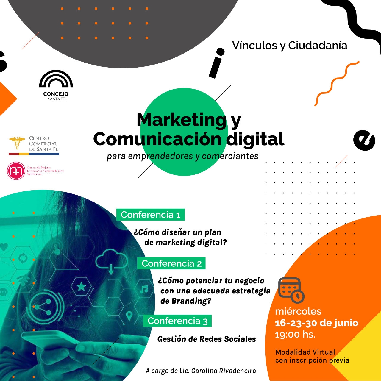 Los días 16, 23 y 30 de junio se llevarán a cabo de manera online una serie de capacitaciones que invitarán a emprendedores y comerciantes a formarse e intercambiar experiencias sobre marketing y comunicación digital. Serán tres encuentros denominados: ¿Cómo diseñar un plan de marketing digital?; ¿Cómo potenciar tu negocio con una adecuada estrategia de Branding?; y Gestión de Redes Sociales. Los tres encuentros estarán a cargo de la Lic. Carolina Rivadeneira.