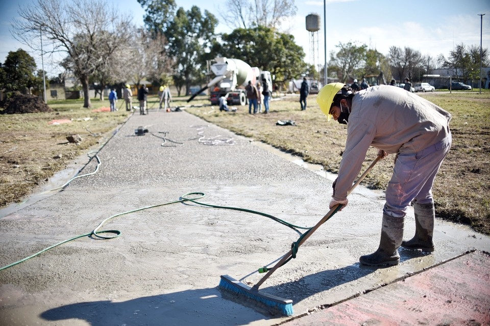 La plaza contará, además, con la construcción de bordillos de hormigón premoldeado para delimitar las áreas verdes de las secas, la construcción de veredas y otros solados de hormigón armado ferrocementado, vados peatonales para la circulación segura.
