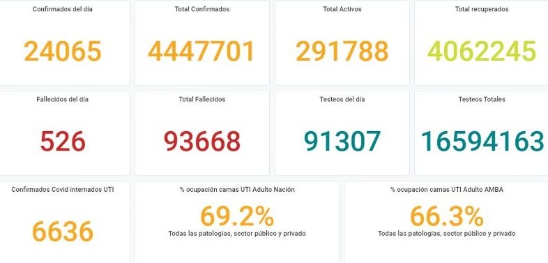 A 483 días del primer caso confirmado de coronavirus, la Argentina se acerca a los 94 mil muertos. El ministerio de Salud reportó que en las últimas 24 horas hubo 526 víctimas fatales.