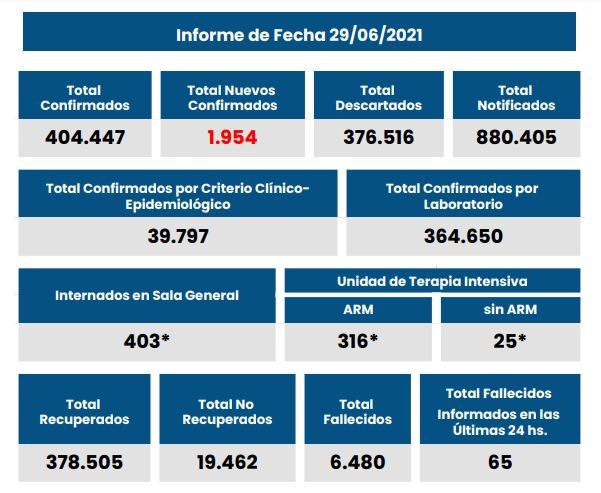 El total de casos confirmados desde el inicio de la pandemia asciende a 404.447 y los muertos llegan a 6.480.