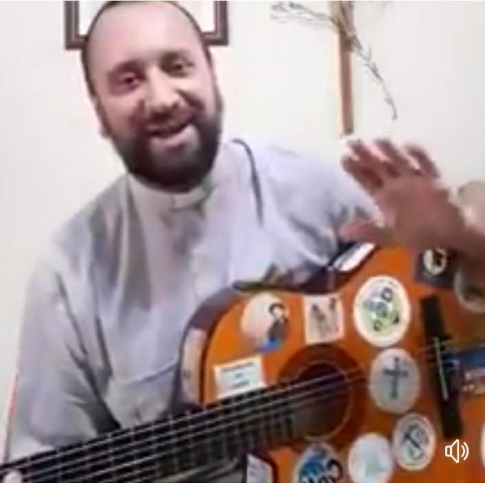 “Ahora, voy a utilizar una viejita que tenía en la casa de mis padres. No voy a dejar de tocar y de cantar. Por las dudas, les cuento que la guitarra tenía muchos stickers religiosos”, señaló el sacerdote.
