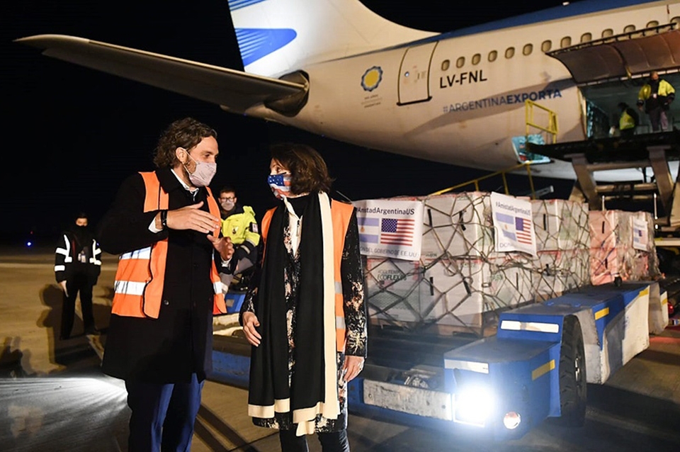 Las dosis desarrolladas por la empresa estadounidense de biotecnología Moderna llegaron en dos vuelos de Aerolíneas Argentinas, y fueron enviadas por el Gobierno de Estados Unidos como parte de las donaciones que realiza la administración del presidente Joe Biden a países en desarrollo.