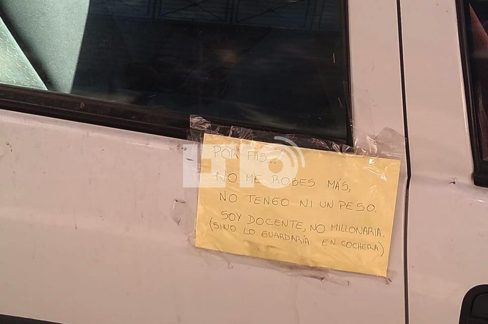 Pero la impotencia y el desánimo ante los hechos de inseguridad, también encuentra otras expresiones. Es el caso de una docente que dejó pegado un cartel en su auto, pidiendo a los ladrones que no lo roben.