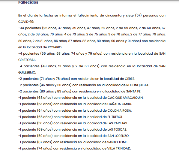 Además, informaron 57 fallecidos, dos pacientes de la capital santafesina de 80 y 83 años.