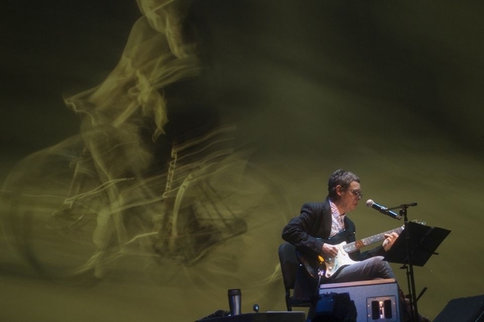 Sentado con las piernas cruzadas, anteojos, atril y su guitarra eléctrica, el músico invitó a la audiencia a sumirse en un viaje íntimo, plagado de historias, sentires, recuerdos, humor inteligente, complicidad e imágenes, siempre con la canción como protagonista y el corazón adelante.