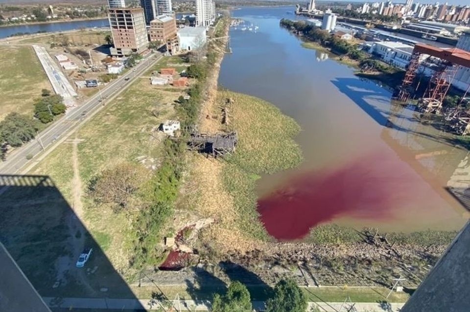El usuario de Twitter Obsesivamente (@obsesivamente) publicó este martes las fotos de la sorpresiva aparición de una mancha roja sobre las aguas del Dique II y las imágenes se viralizaron.