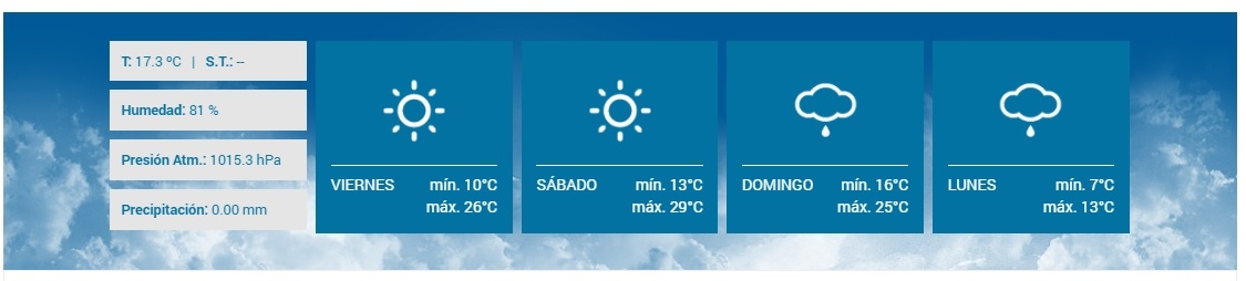 Viernes: min. 10° - máx. 26°.  Cielo mayormente despejado, o con alguna nubosidad por momentos. Condiciones estables. Temperaturas en ascenso. Vientos leves a moderados predominando del sector este/noreste.