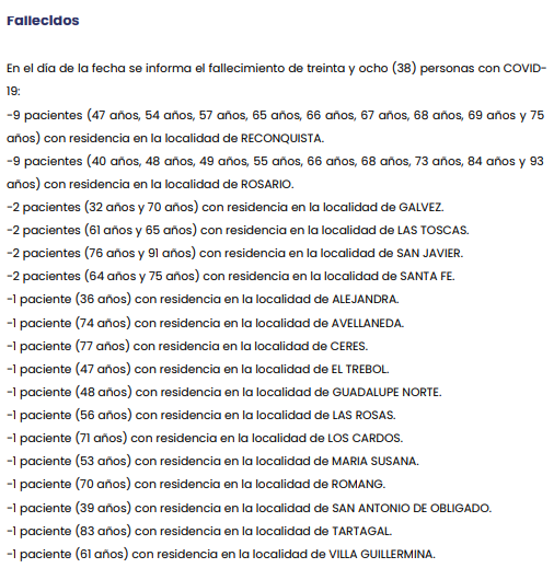 Además, registraron 38 fallecidos, dos pacientes de la capital santafesina. El detalle de muertes por localidad: