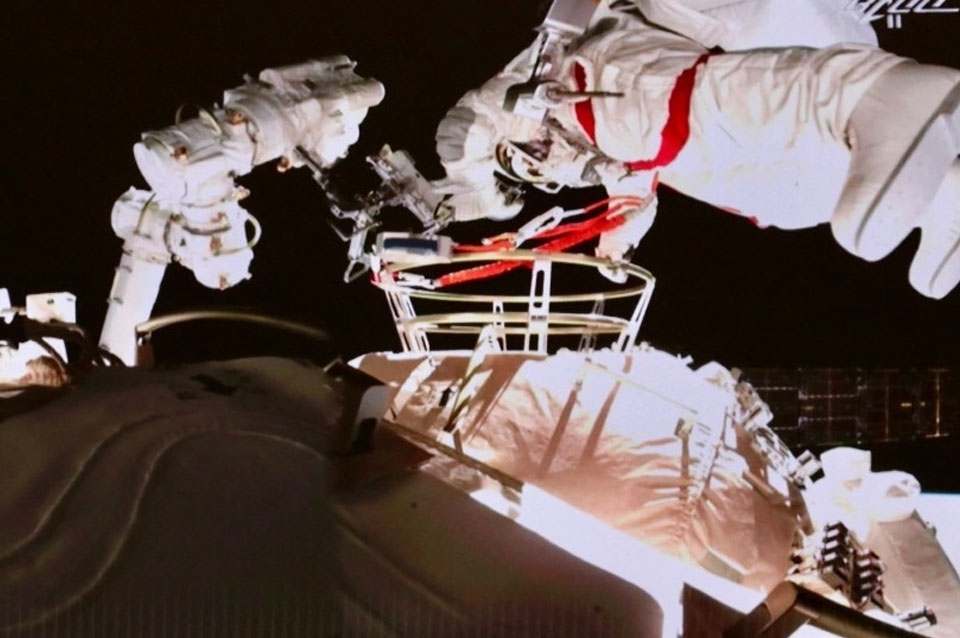 Los astronautas Nie Haisheng y Liu Boming salieron del módulo Tianhe para instalar reposapiés y un banco de trabajo en el brazo robótico de la estación.