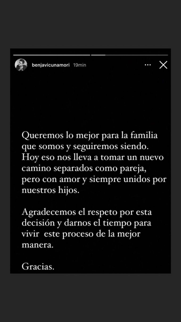 "Agradecemos el respeto por esta decisión y darnos el tiempo para vivir este proceso de la mejor manera. Gracias", cerró, en un intento de frenar los rumores que habrían surgido. Por ahora, su ahora expareja no se expresó al respecto.