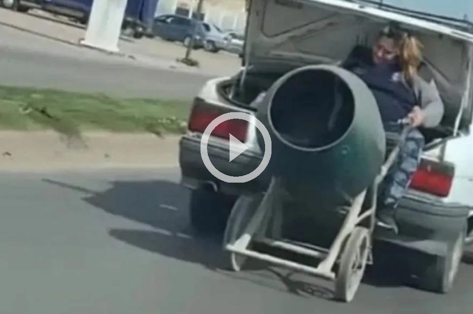 Parece una escena sacada de una película o de una serie de TV humorística al estilo Los tres chiflados, sin embargo es muy real y ocurrió en el conurbano bonaerense. Se trata de una secuencia que registró el conductor de un auto y que pudo captar a una mujer, sentada en el baúl de otro auto, y que llevaba una mezcladora de cemento.