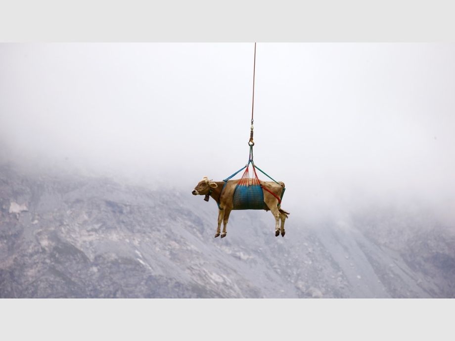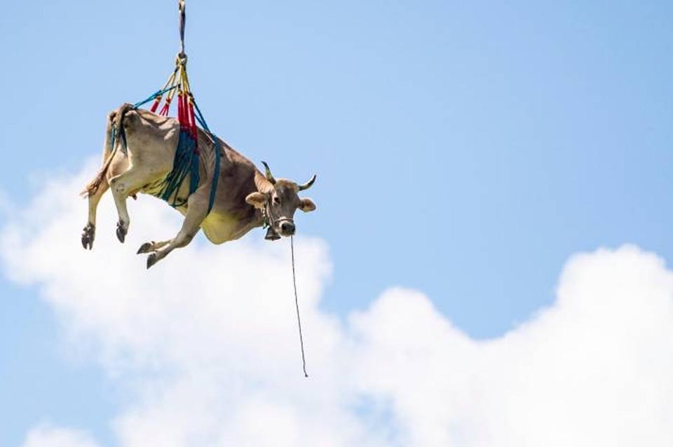 Sin embargo, los animales están expuestos a distintos peligros y, en ocasiones, sufren lesiones que limitan su movilidad, por lo que este año aquellas vacas que no estuvieron en condiciones de emprender la caminata de vuelta a casa fueron aseguradas a la parte inferior del helicóptero y transportadas a las tierras bajas cercanas al paso Klausen.