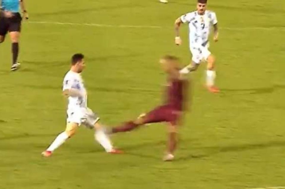 A los 29 minutos del primer tiempo en el partido que disputaban Argentina y Venezuela, Lionel Messi recibió por parte del defensor Luis Martínez un brutal planchazo que le costó al local quedarse con un hombre menos.