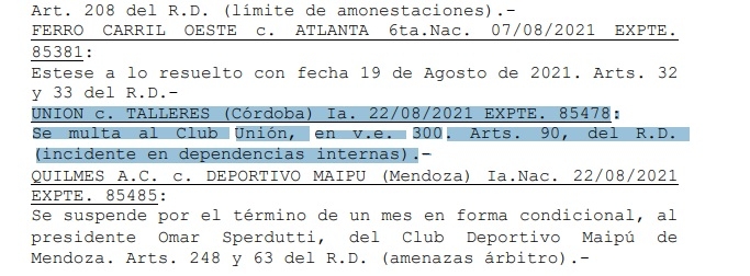 Pero no sería lo único, porque el Tribunal de Disciplina le aplicó una multa, que se conoció en el último boletín: "Se multa al Club Unión, en v.e. 300. Arts. 90, del R.D. (incidente en dependencias internas)."