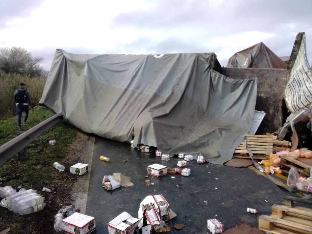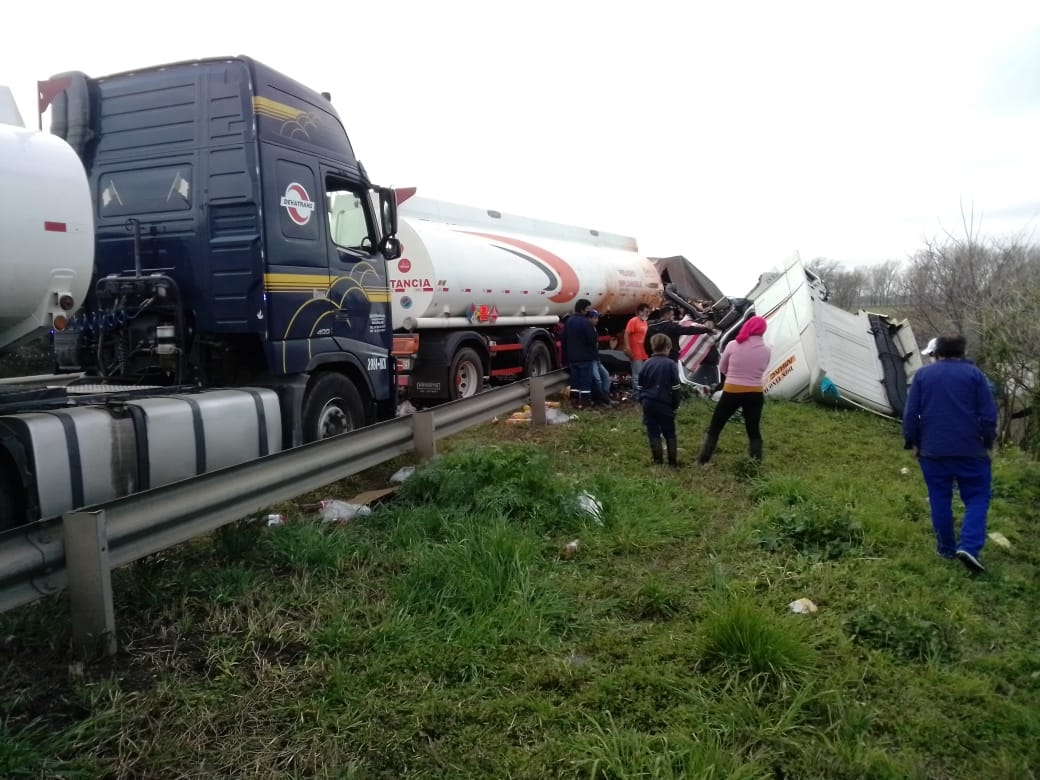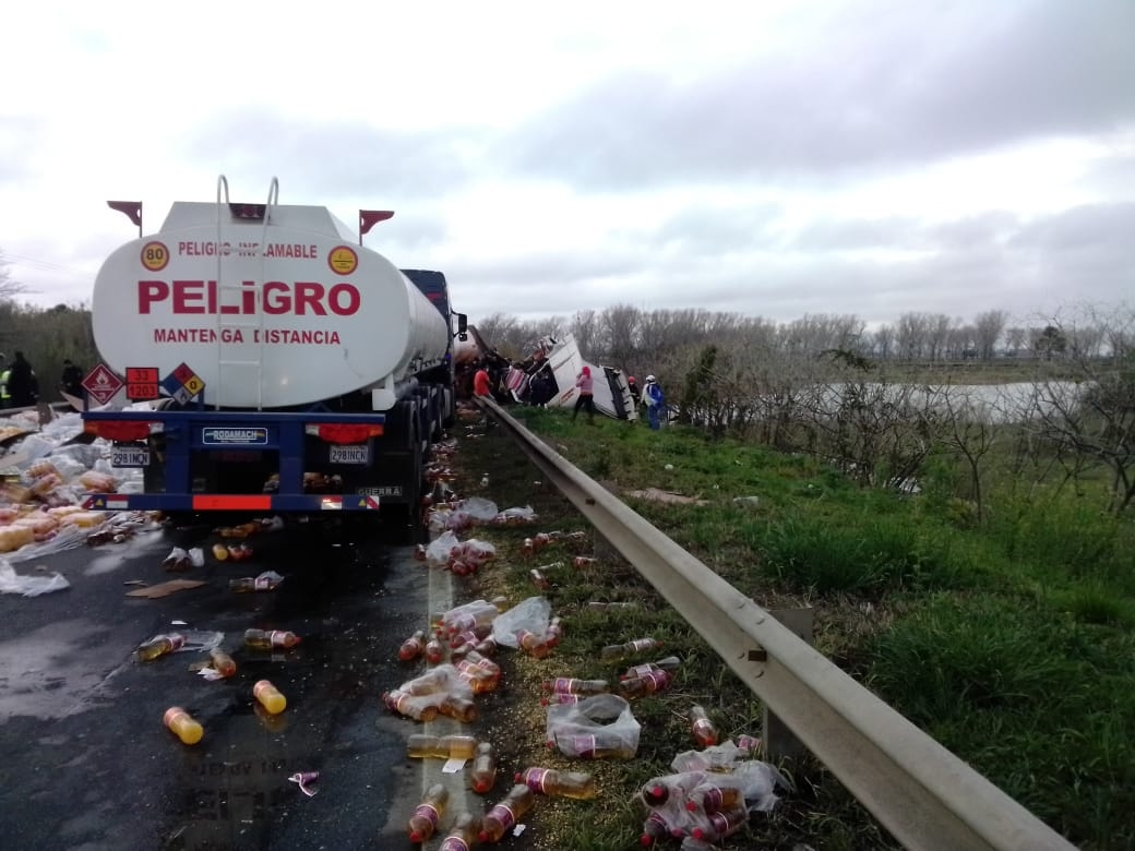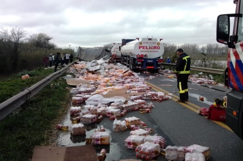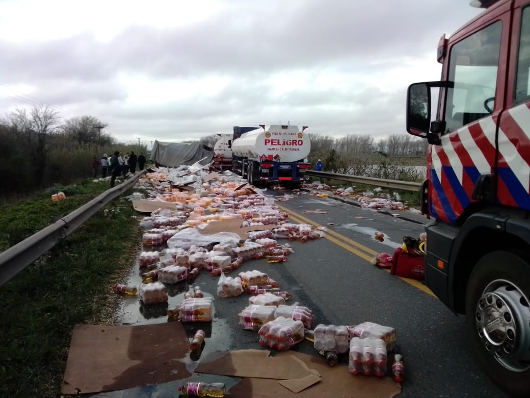 Los vehículos involucrados son un camión cisterna y otro que trasladaba mercadería, principalmente bebidas que quedaron desparramadas por el asfalto.
