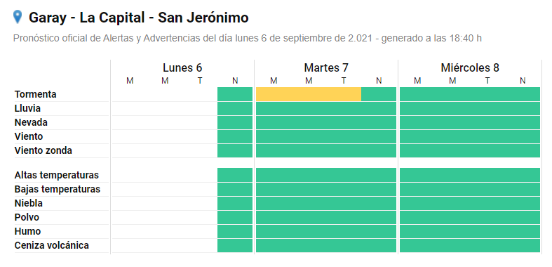 Según el organismo, el área será afectada por lluvias y tormentas, algunas fuertes, que pueden estar acompañadas de ráfagas, caída de granizo, intensa actividad eléctrica y abundante caída de agua en cortos períodos. En ese sentido, se comunicó que se esperan valores de precipitación acumulada entre 40 y 60 milímetros, pudiendo ser superados de forma puntual.