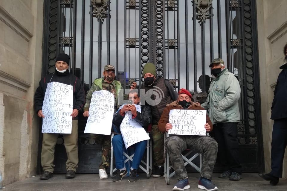 Desde la mañana de este jueves soldados continentales de Malvinas protestan frente a Casa de Gobierno para pedir ayuda económica. Se trata de un grupo de exsoldados que no estuvieron combatiendo en las islas, pero sí en el continente y que piden obra social y ayuda económica para poder vivir. Además, quieren que los reciba el Gobernador. Algunos de ellos se encadenaron al edificio gubernamental.