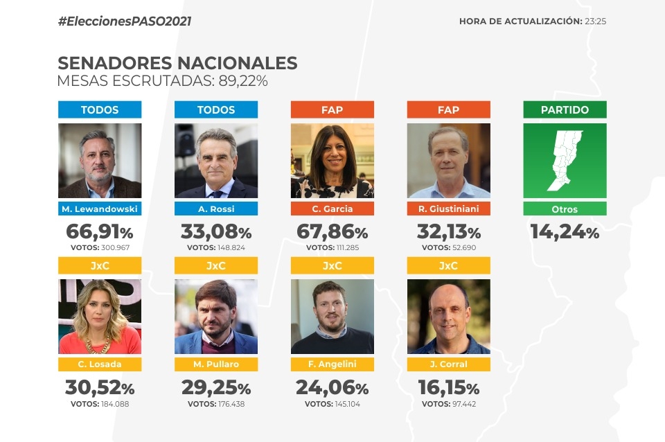 En la categoría senadores nacionales, los tres principales espacios partidarios tuvieron internas en nuestra provincia: el Frente de Todos, el Frente Amplio Progresista y Juntos por el Cambio.