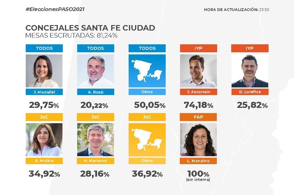 En tanto, en el Frente de Todos, Jorgelina Mudallel ( 29,87%) lidera, seguida por Alejandro Rossi (20,18%) y Marcela Aeberhard (15,54%).