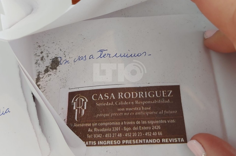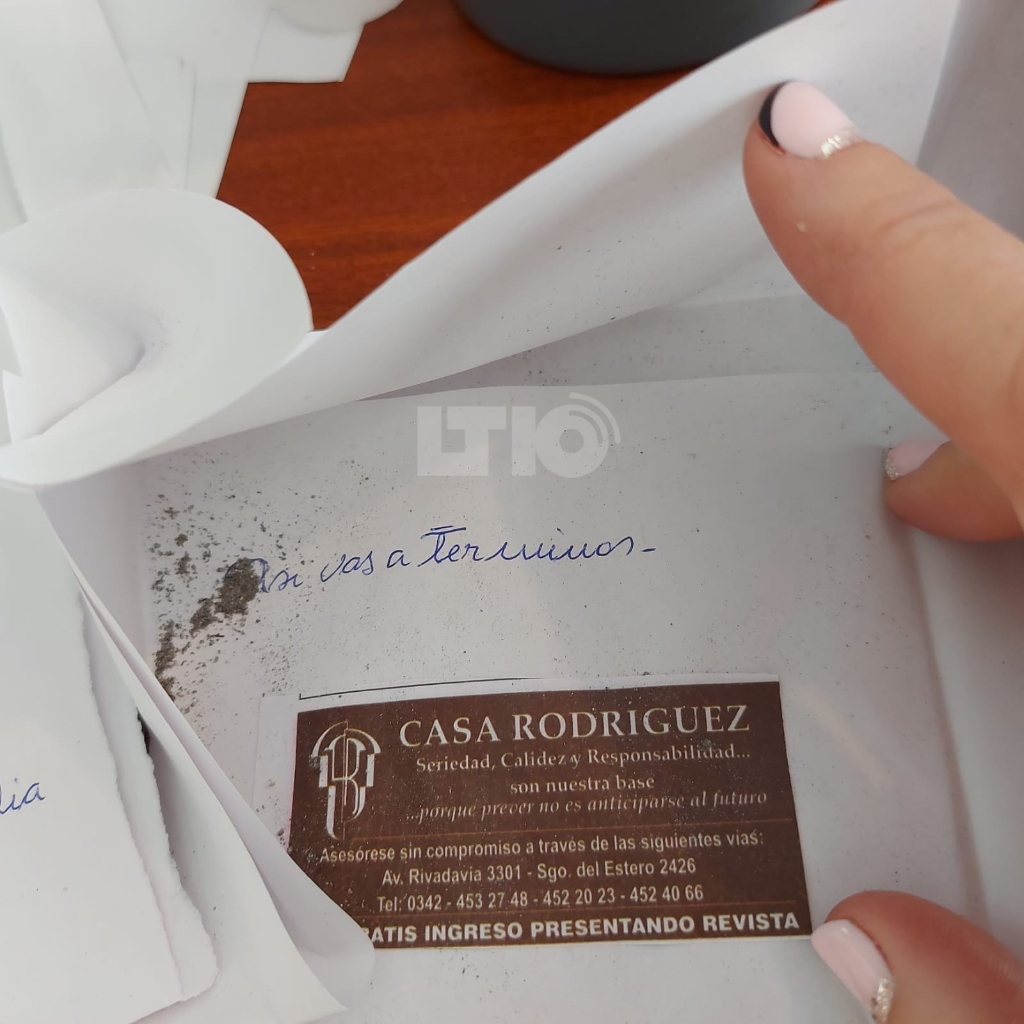 Concretamente, adentro había cenizas y las tarjetas de casas fúnebres de la ciudad (para Ceresola, de Casa Rodríguez, y para Suárez, de Sentir), además de un papel con la inscripción “así vas a terminar”, a mano, con birome y en manuscrito.