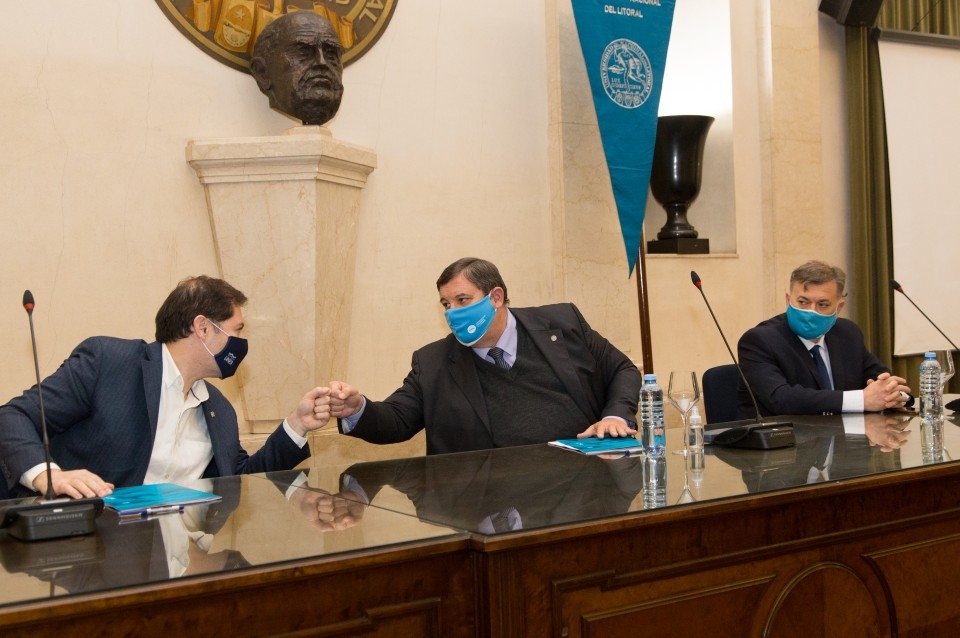 La Universidad Nacional del Litoral (UNL) y la Universidad Nacional de Entre Ríos (UNER) firmaron el convenio específico de asistencia técnica: “Anteproyecto para el Laboratorio de Tecnologías I+D+i de la Facultad de Ingeniería de la Universidad Nacional de Entre Ríos”. Fue en el marco de un acto que se concretó este martes 14 de septiembre, en el recinto del Consejo Superior de la UNL; y estuvo encabezado por el rector de la UNL Enrique Mammarella; el decano de la Facultad de Arquitectura, Diseño y Urbanismo (FADU-UNL), Sergio Cosentino; y el decano de la Facultad de Ingeniería de la UNER (FI UNER), Diego Campana. Se contó también con la presencia de autoridades de FADU-UNL, de FI UNER, de la Secretaría de Vinculación y Transferencia Tecnológica, del Cetri Litoral, docentes y coordinadores técnicos del trabajo enmarcado en dicho proyecto.