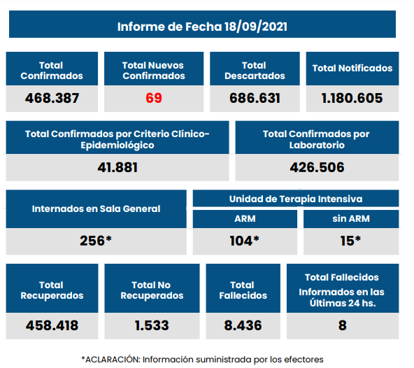 El Ministerio de Salud reportó 69 nuevos casos de coronavirus en la provincia y ocho fallecimientos en las últimas 24 horas.