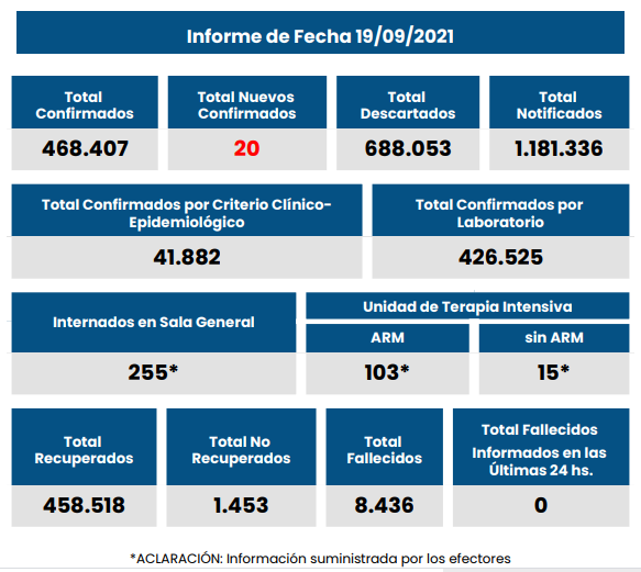 No se reportaron nuevos fallecimientos, por lo que la cifra de decesos desde el comienzo de la epidemia se mantiene en 8.436.