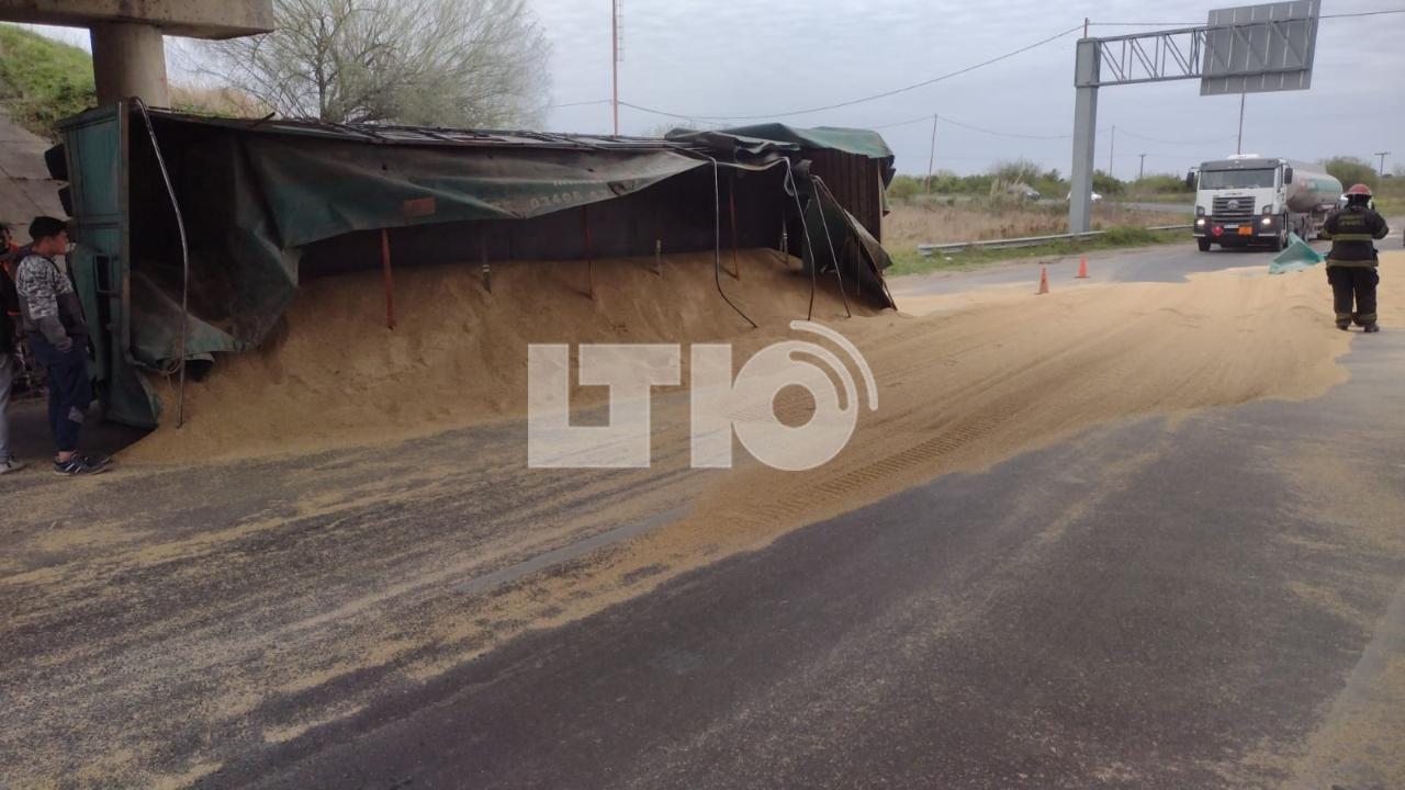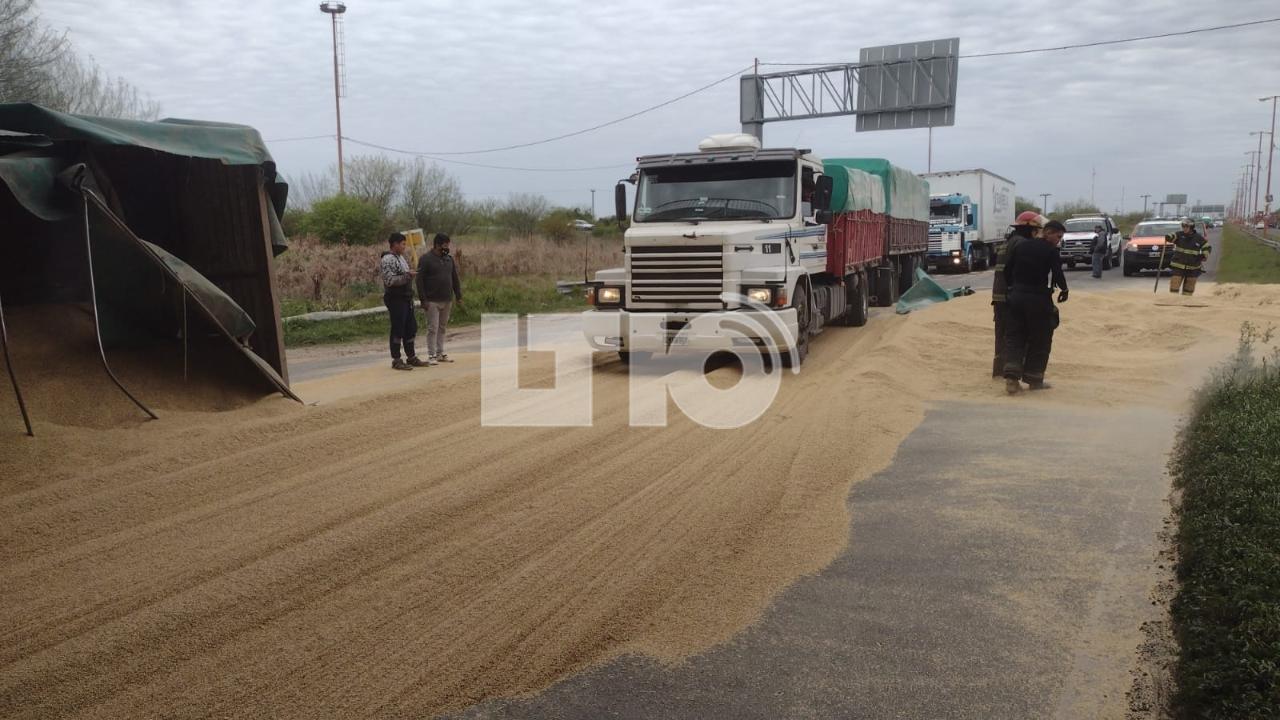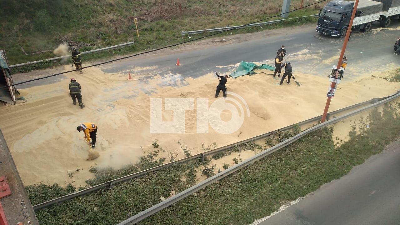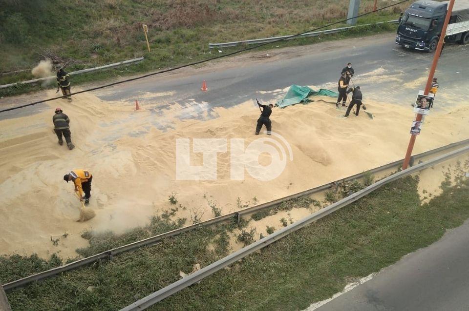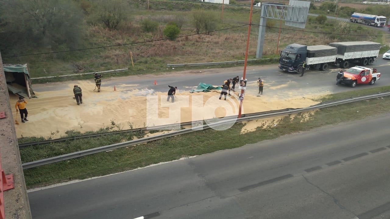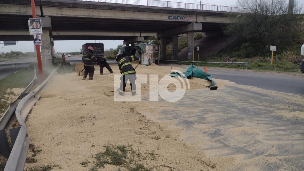 Si bien sólo volcó el acoplado, y no así la cabina, toda la cebada que trasladaba quedó en plena calle provocando un corte completo en el tránsito en la zona.