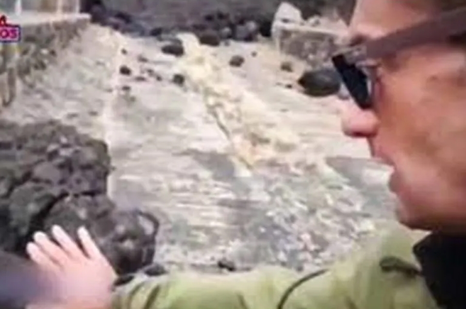 “Vemos la piedra volcánica que está súper caliente”, comenzó diciendo a cámara el reportero Alejandro Rodríguez mientras grababa una lengua de lava justo cerrándole el paso justo detrás de él. “Está súper caliente. Por dentro está al rojo vivo”, prosiguió el relato mientras aproximaba su mano a una de las rocas de lava. “Por primera vez tocando una piedra recién hecha al horno”, agregó.