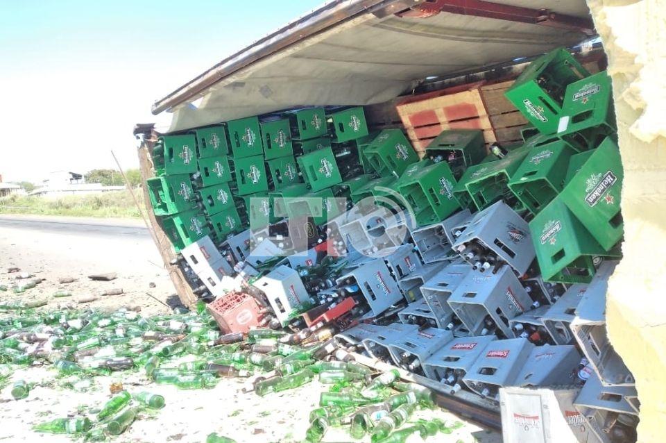 Se trata de un camión de gran porte que trasladaba unos mil cajones de envases de cerveza vacíos, por lo que todo el vidrio roto se encuentra desparramado en la calzada.