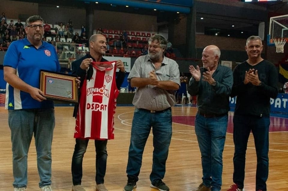El exentrenador de la Selección Argentina estuvo en el estadio cubierto, donde continúa el certamen de la Liga Nacional, y fue reconocido por los dirigentes de Unión.