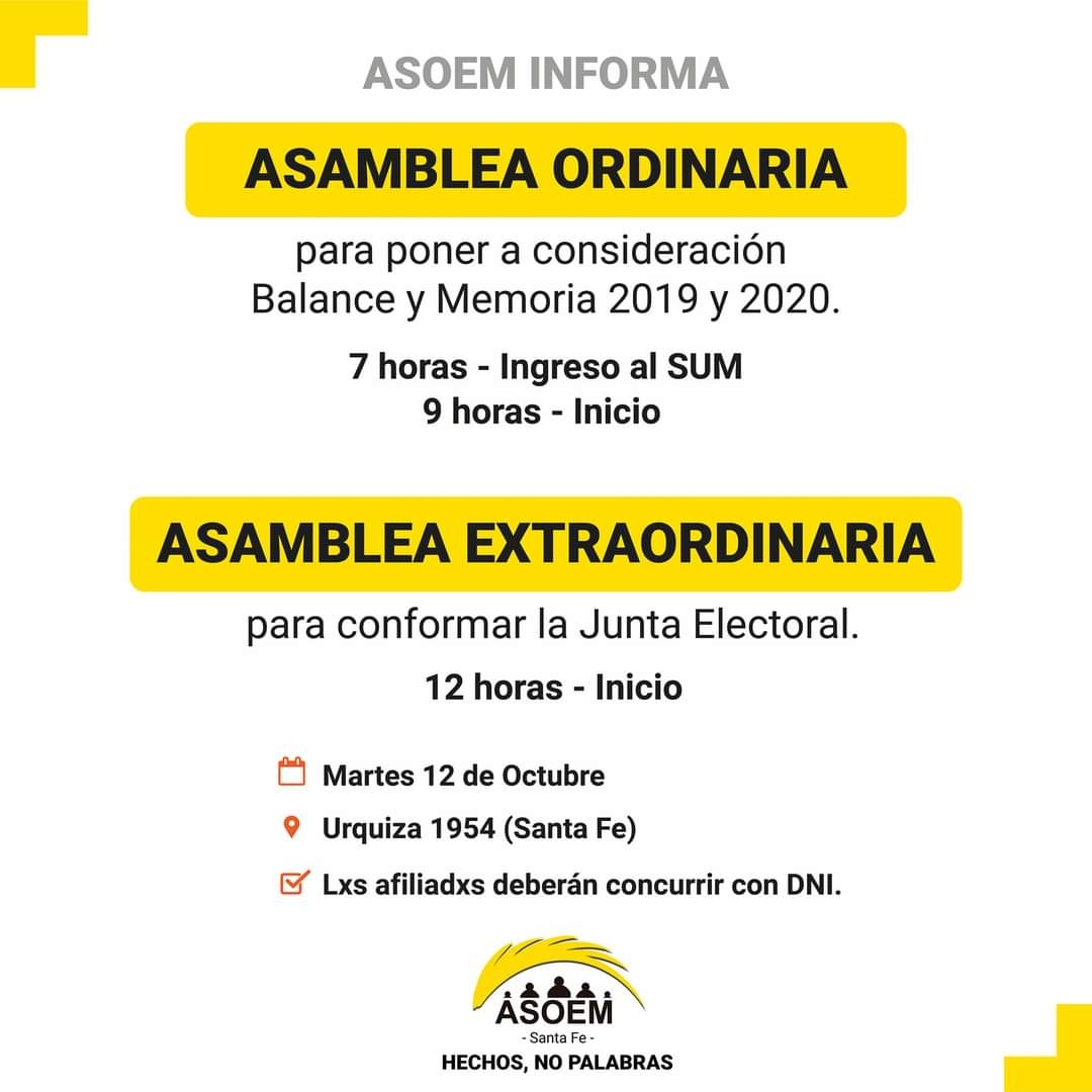 En el transcurso de la mañana de este martes, se realizarán dos asambleas dentro de la sede de ASOEM. La primera será una asamblea ordinaria para la aprobación de balance y memoria del 2019 y 2020 que no se pudieron realizar por la pandemia, y la segunda una asamblea extraordinaria para elegir la Junta Electoral que va a llevar adelante los comicios que se tiene que desarrollar en el mes de diciembre.