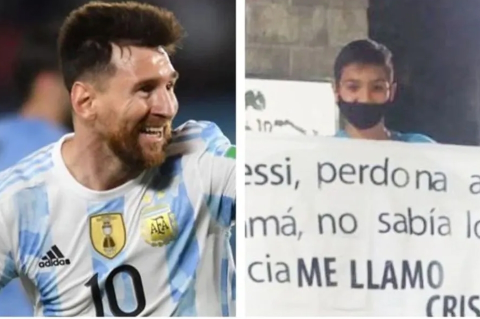 “Messi: perdoná a mi mamá. No sabía lo que hacía, me llamó Cristiano”, decía el mensaje del cartel que el pequeño Cristiano, tal es su nombre, sostenía en la entrada del predio donde la albiceleste está concentrada para el partido contra los incaicos.