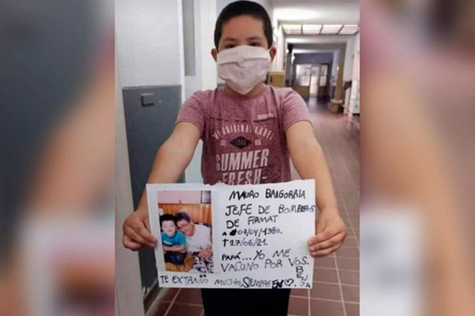 Un niño de Firmat fue vacunado con la primera dosis y registró el momento con un emotivo cartel para su padre que fue víctima de esta pandemia.