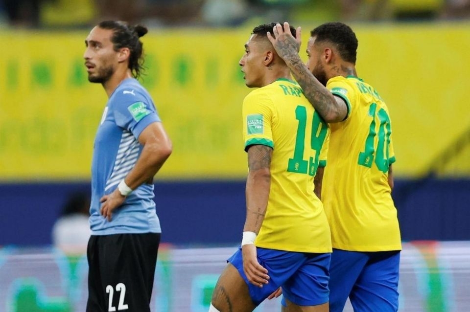 No mejoró mucho Uruguay con esas tres variantes simultáneas y apenas a los 12 minutos apareció nuevamente el jugador del Leeds United de Marcelo Bielsa, Raphinha, a quien Tite incluyó por primera vez como titular (fue su primer encuentro profesional en una cancha brasileña) para "hacerle la segunda a Neymar", y anotó el tercer tanto.