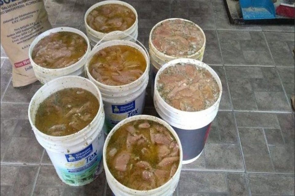 En total fueron secuestrados 150 kilos de pechugas de pollo distribuidos en siete baldes de pintura de 20 litros, dentro de los cuales había preparada una mezcla de huevo y condimentos.