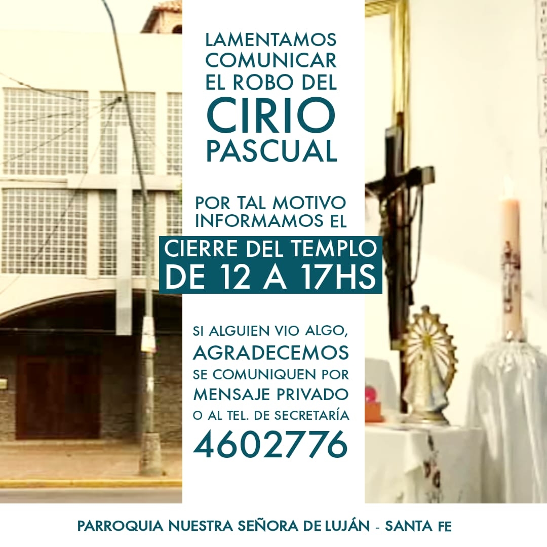 Este miércoles, los fieles, voluntarios y sacerdotes de la Parroquia Nuestra Señora del Lujan notaron que faltaba el cirio que normalmente utilizan para los bautismos. Pero al consultar entre todos los feligreses se dieron cuenta que había sido sustraído del templo.